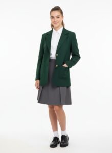 school blazer in bottle green, featuring a smart tailored fit, gold-tone buttons, and durable easy-care fabric — perfect for everyday school wear.